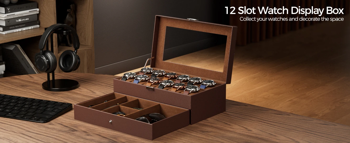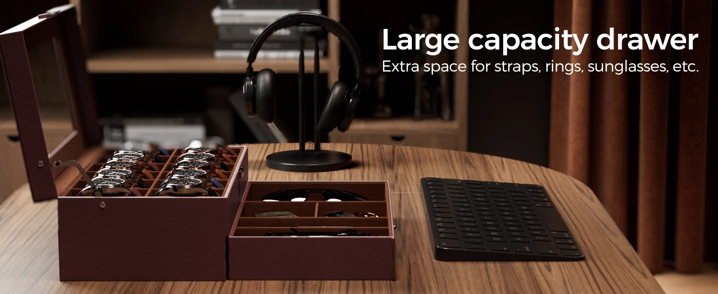 2-Layer: The upper layer can hold 12 watches, and the bottom drawer offers additional storage for watchbands, cufflinks, bracelets, rings, pens, necklaces, and other jewelry, keep them in one place and protect them against dampness, shaking and friction, or missing